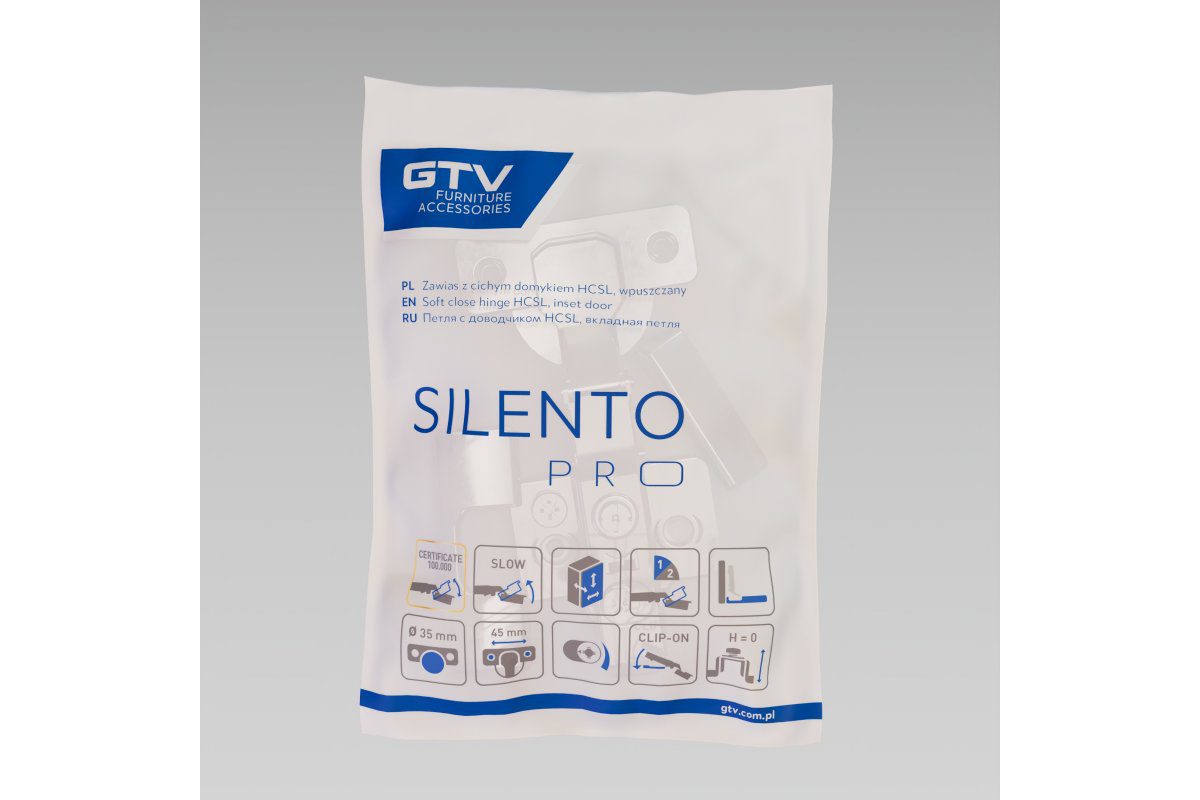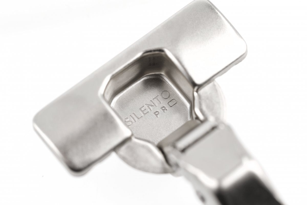 The hinge from the Silento PRO family is characterized by an extraordinary strength of 80,000 cycles, which is confirmed by the SGS certificate. Built-in silent close function ensures quiet and safe operation. The product is distinguished by eccentric depth adjustment, integrated in the hinge arm and CLIP-ON chain mounting, which facilitates installation. It is complemented by a two-stage spring that protects adjacent furniture and the wall. An eccentric adjustable chain is included, giving you full 3D adjustment.