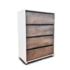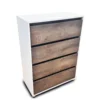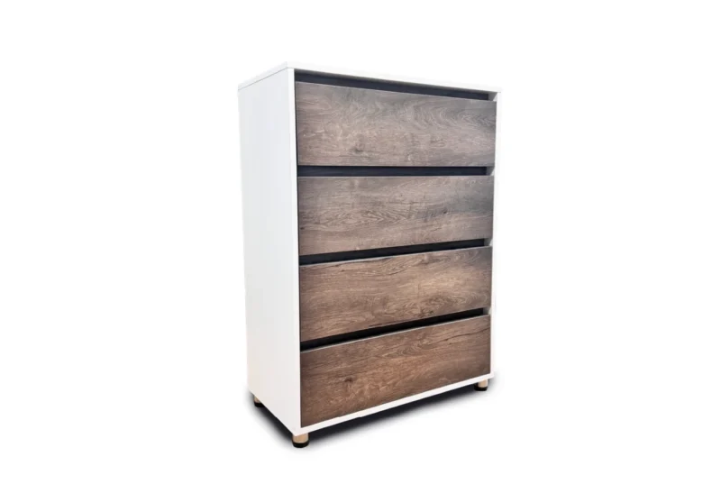 Comodă elegantă, ideală pentru dormitor sau living. Cu un contrast rafinat între alb mat și sertare în finisaj nuc închis, oferă 4 sertare spațioase și picioare reglabile pentru stabilitate pe orice suprafață.