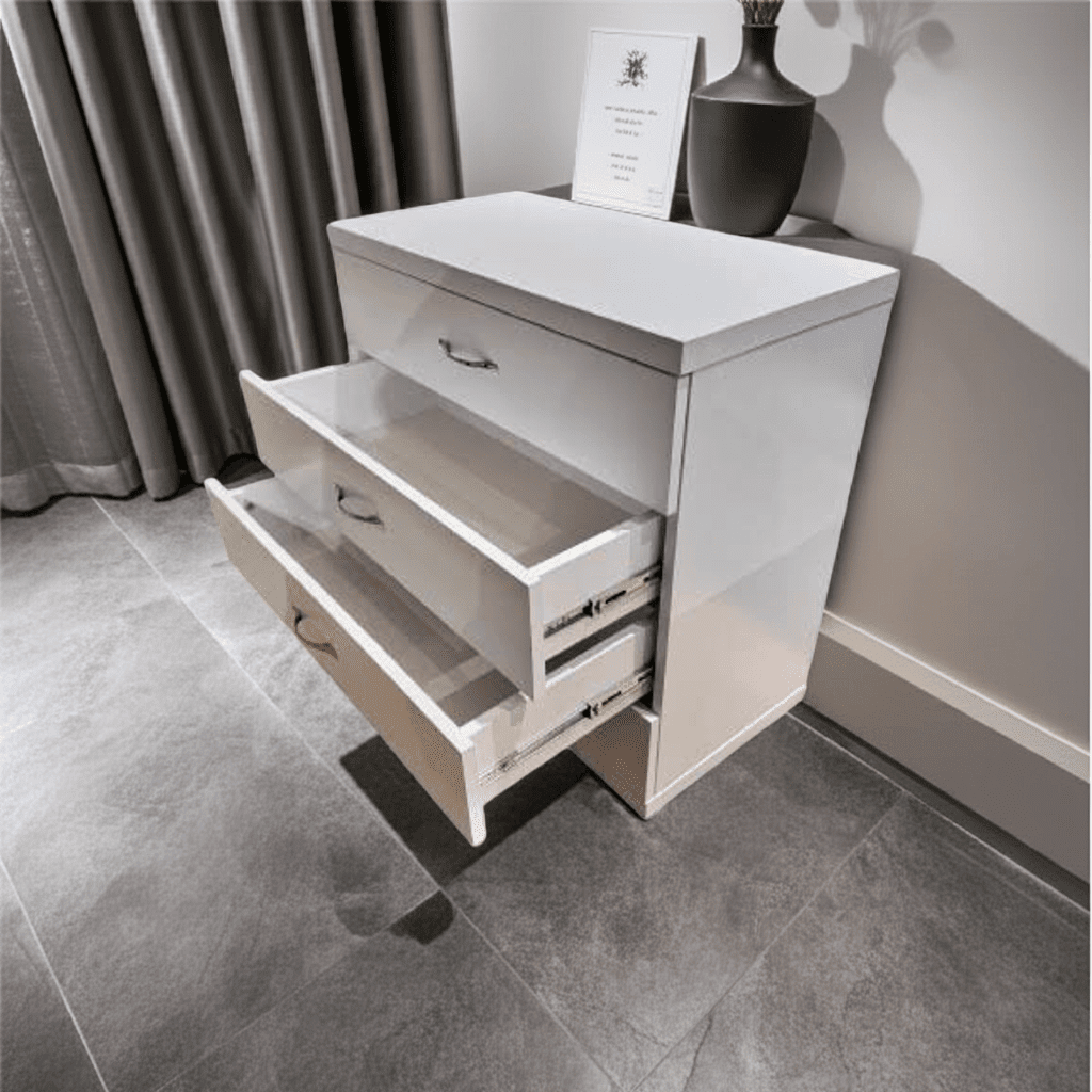 Comodă albă cu 4 sertare spațioase, realizată din PAL de calitate, cu capac și fund dublu pentru rezistență îmbunătățită. Design modern, ideală pentru dormitor sau hol. Picioarele reglabile oferă stabilitate perfectă pe orice suprafață. Dimensiuni: Lungime 80 cm, Adâncime 40 cm, Înălțime 80 cm. Fabricată în Moldova.