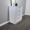 Comodă albă cu 4 sertare, ideală pentru spații mici. Fabricată din PAL rezistent, oferă durabilitate și funcționalitate. Design modern, perfect pentru dormitor, hol sau birou.