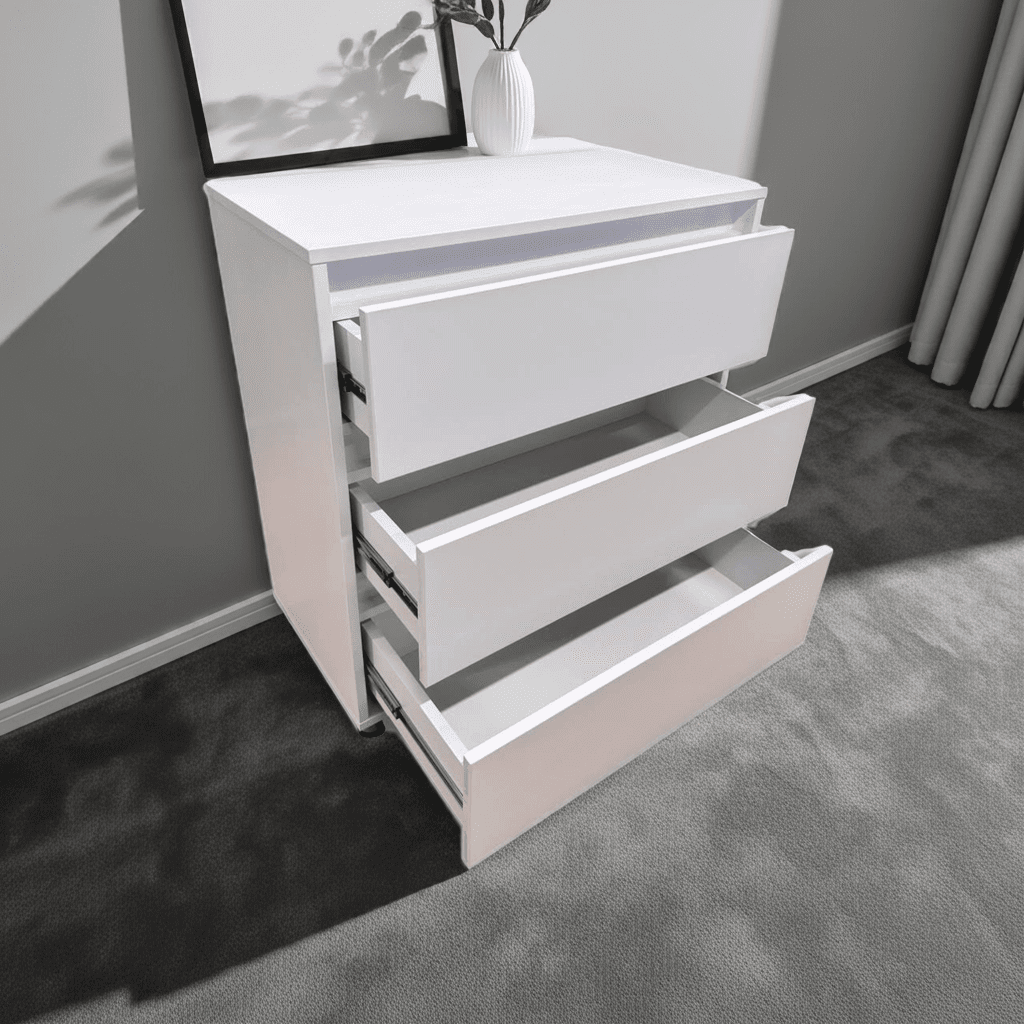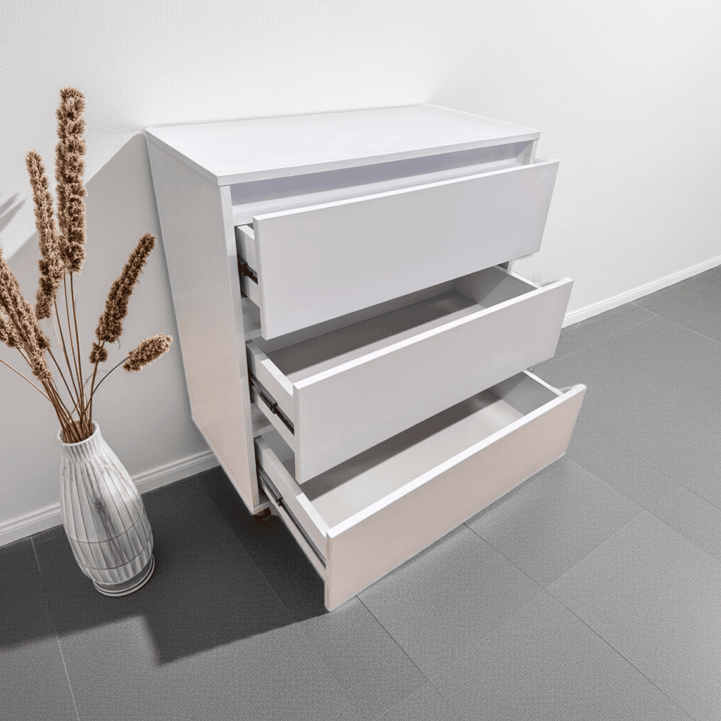 Comodă albă din PAL cu design minimalist, prevăzută cu 3 sertare spațioase fără mânere – ideală pentru interioare moderne. Finisajul alb mat oferă un aspect curat și elegant, ușor de integrat în dormitor, hol sau birou. Cu dimensiuni compacte (L800xA400xH850 mm), această comodă oferă un echilibru perfect între funcționalitate și stil. Sertarele sunt ușor de deschis datorită decupajului frontal, fără mânere vizibile. Fabricată în Moldova, cu grijă pentru detalii.
